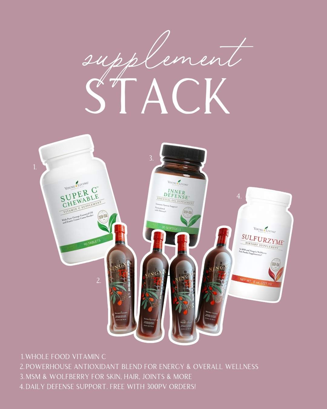 Support your immune system and seasonal energy with your December supplement stack! Whole food vitamin C for daily defense, NingXia Red for antioxidant-rich vitality, Sulfurzyme Powder for gut, joint, and skin health, and Inner Defense (free this month!) to keep you feeling strong and well all season long.
