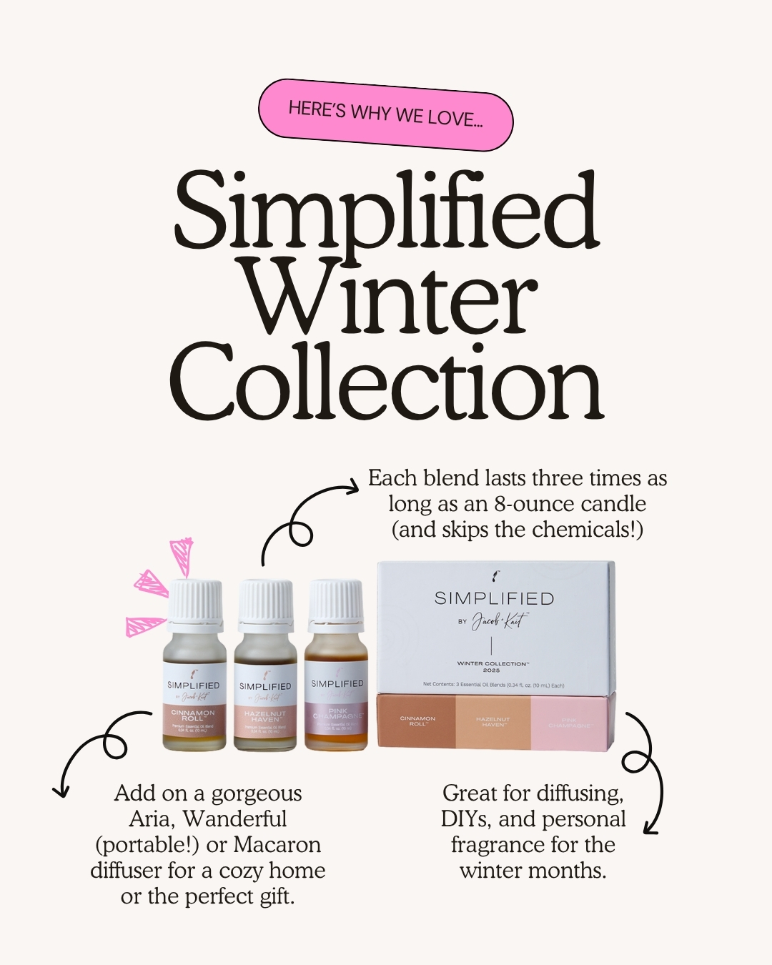 These three limited-edition blends are inspired by festive treats, cozy gatherings, and sparkling celebrations. Cinnamon Roll, Hazelnut Haven, and Pink Champagne – they are perfect for all the winter things!
